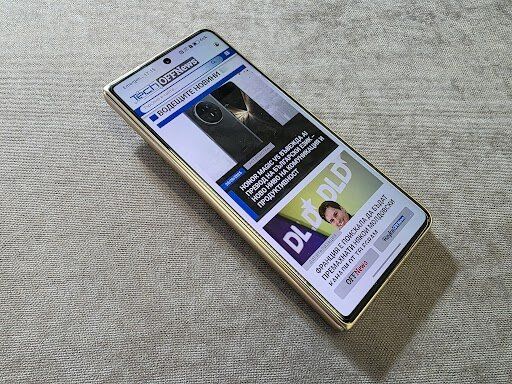 Тук е мястото да уточним, че размерите 4,1 мм. широчина в разгънато състояние и 8,8 мм. в сгънато са характерни за бялата версия - в цвят “слонова кост”, която не е достъпна у нас. Ние имахме възможност да тестваме версията в цвят “златиста зора” (Down Gold), при която тези показатели са съответно 4,2 мм. и 9 милиметра. Като цяло можем да кажем, че при работа с апарата в сгънато състояние той се усеща като стандартен несгъваем смартфон. И дебелината му е почти сравнима с това. Друга особеност на панела е, че е защитен от въглеродни влакна.